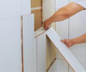 التركيب والترويب استخدام الغراء المناسب ثم ملء الفواصل بمواد (Grout) مقاومة للبكتيريا.